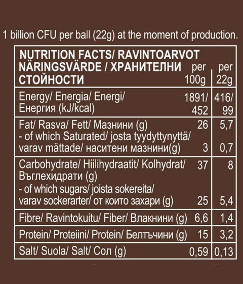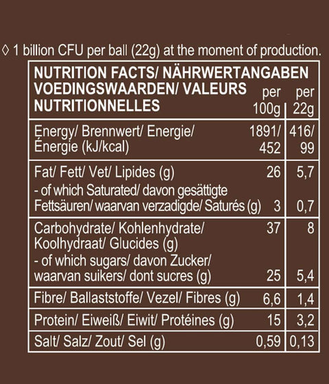Συστατικά: χουρμάδες*, αμύγδαλα*, νέκταρ από άνθη καρύδας*, καρύδια Βραζιλίας*, πρωτεΐνη κάνναβης*, σκόνη κακάο*(5%), σκόνη μάκα*(3%), Lactobacillus acidophilus (vegan).