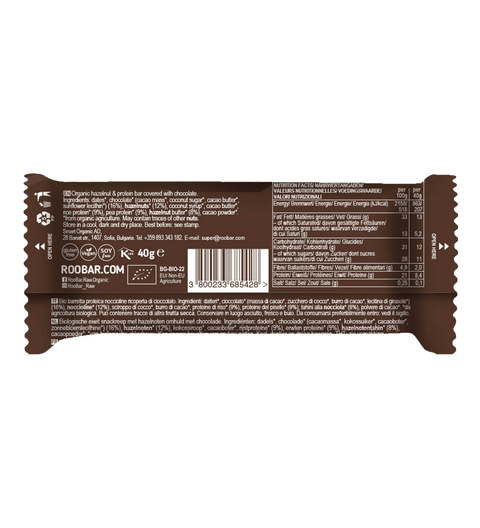 Απολαύστε τις υπέροχες μπάρες πρωτεΐνης μας καλυμμένες με σοκολάτα και ολόκληρα φουντούκια. Ο εξαιρετικός συνδυασμός πρωτεΐνης ρυζιού και μπιζελιού ολοκληρώνεται με ολόκληρα καβουρδισμένα φουντούκια, κακάο και βούτυρο αμυγδάλου και σκόνη κακάο.